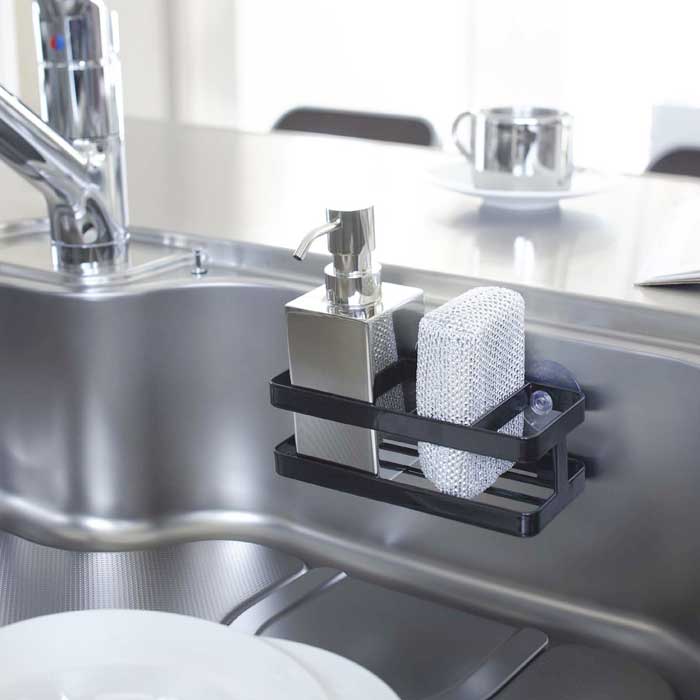 キッチンスポンジや洗剤ボトルを、水切りしながら清潔に収納できる吸盤付きホルダーです。