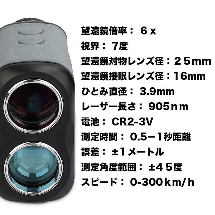 望遠鏡倍率: 6x 視界: 7度 望遠鏡対物レンズ径: 25mm 望遠鏡接眼レンズ径: 16mm ひとみ直径: 3.9mm レーザー長さ: 905nm ガラスコーティング: 多層膜全面コーティング 電池: CR2-3V 測定時間: 0.5−1秒距離誤差: ±1メートル 測定角度範囲: ±45度 スピード: 0-300km/h質量: 184g サイズ: 106*40*72mm低電圧知らせ: 有ピン(旗竿)ロック: 有 スキャン: 有防水:有 ●セット内容 ボックス* 1個 巾着バッグ*1 測距計*1 説明書*1 ネックストラップ*1 レンズ拭き専用布*1 電池*1 • パワーオン/パワーオフ Power on: 電源ボタンを2秒以上押す。